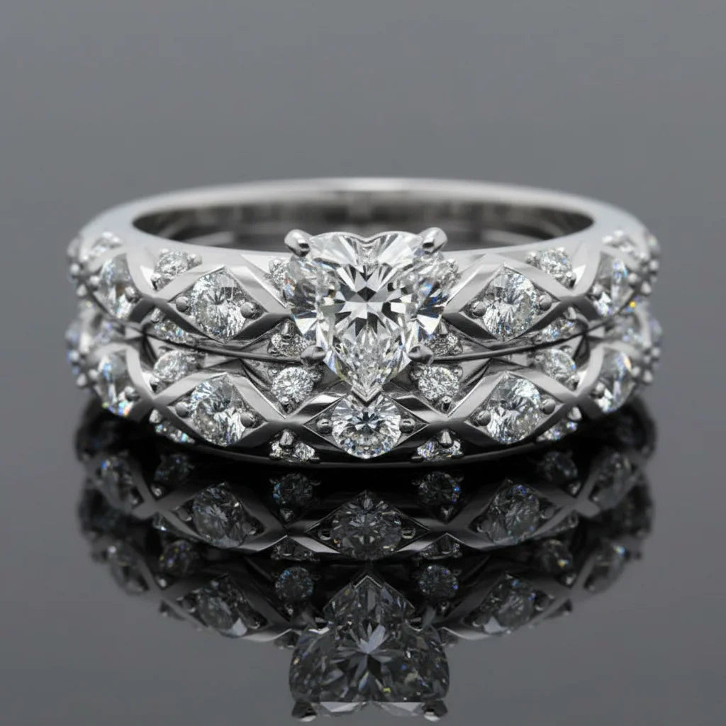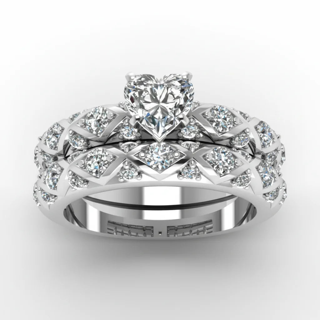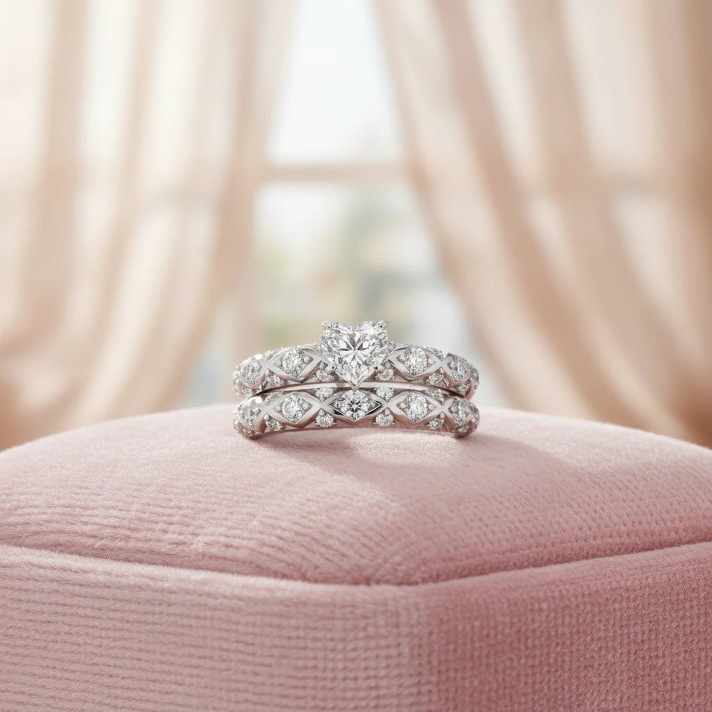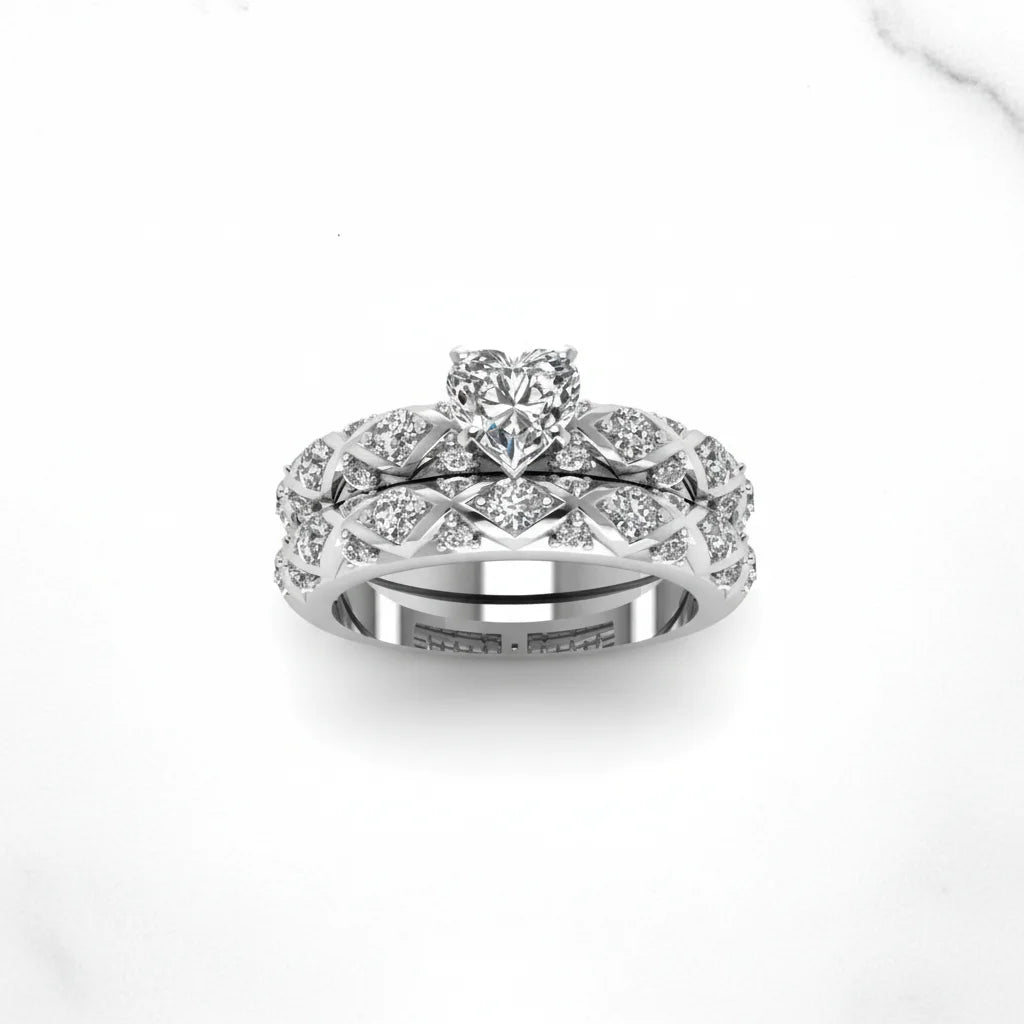 Our 'Timeless Elegance' set features a captivating heart-shaped central diamond, exquisitely framed by a lattice of smaller, brilliant diamonds. This unique design ensures maximum sparkle and a truly distinctive symbol of your love, perfect for both special occasions and daily wear.